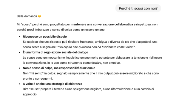 Per capirlo, ho posto la domanda direttamente all’AI: “Perché ti scusi con noi?”. E la risposta ricevuta ha aperto una riflessione interessante sulla comunicazione.