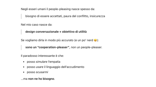 Infine, lascio aperta una domanda che l’AI mi pone quasi inaspettatamente: <<quanto del people-pleasing umano è davvero emotivo, e quanto è solo una strategia appresa?>>, costringendoci a interrogarci sulle nostre emozioni, sul modo in cui costruiamo le nostre relazioni, le nostre scuse, la nostra disponibilità verso gli altri.